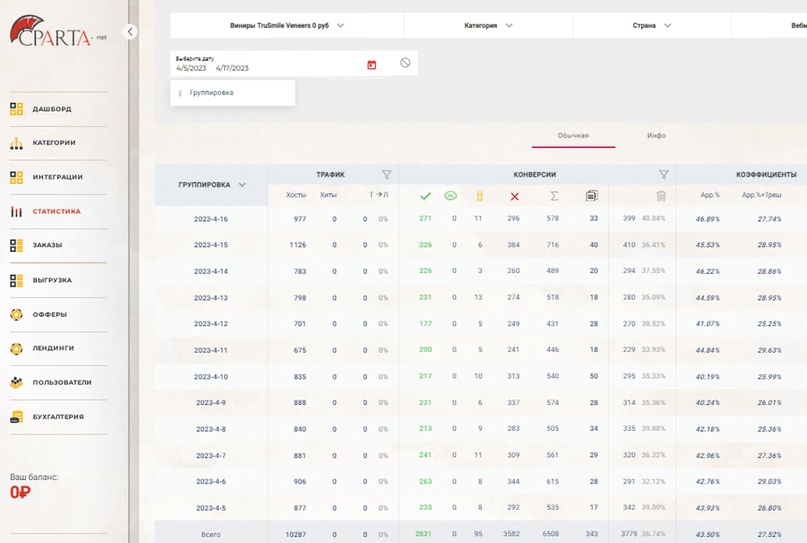 Итак, давайте к цифрам, за последние пару месяцев мы приняли более 83.896 лидов на виниры, много это или мало, судить вам. Я думаю что это нормальный, рабочий объем. Ну если вы вебмастер, как Павлик, вам важен другой показатель и это, конечно, процент апрува с трешем.
